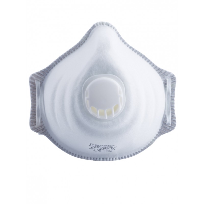 Demi-masque respiratoire filtrant. FFP3 NR D. Boîte de 10 pièces. Forme conique. Préformé. Usage unique. Elastique de fixation continu sans latex. Bride réglable. Joint facial. Non-tissé polypropylène. Coloris blanc. Avec valve d'expiration, facilite la respiration.