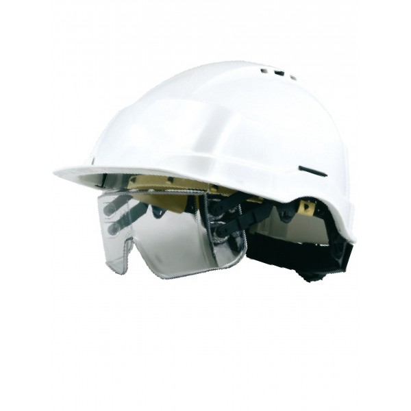 Casque IRIS à lunette-masque intégrée sous la visière. Aérations réglables. L'IRIS est constitué d'une calotte en polyamide, d'une coiffe en polyéthylène basse densité comportant une araignée, un bandeau de tour de tête amovible et réglable de 53 à 63 cm, monté avec une garniture de confort en basane et une mousse.