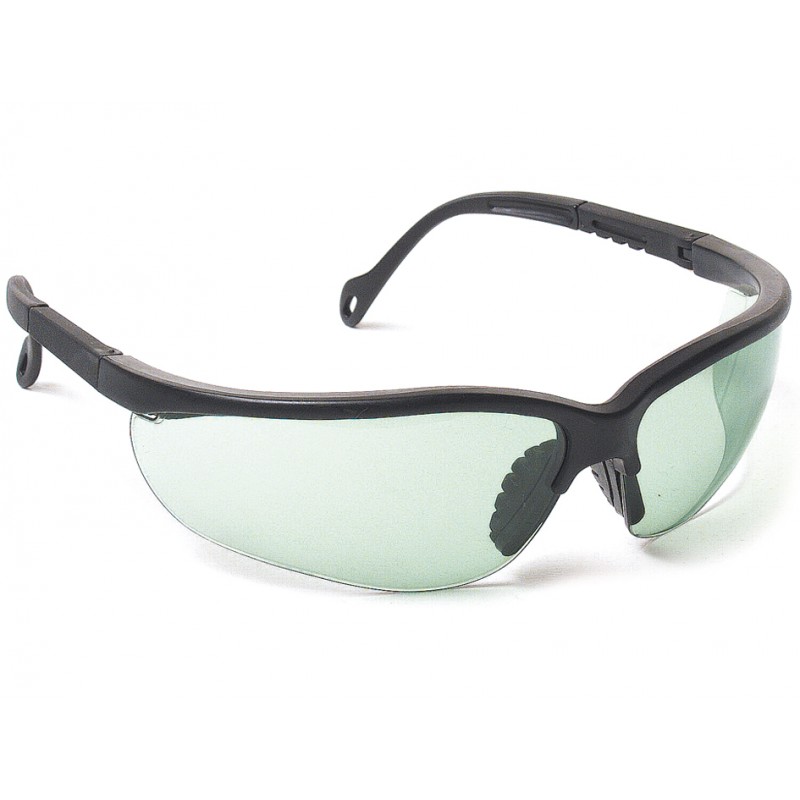 Lunettes de protection. Branches réglables (4 positions). Coloris noir. Pont de nez souple en P.V.C. Monture en polyamide. Oculaires coloris vert avec traitement antibuée et anti-rayures en polycarbonate. Epaisseur oculaires: 2.00 mm.