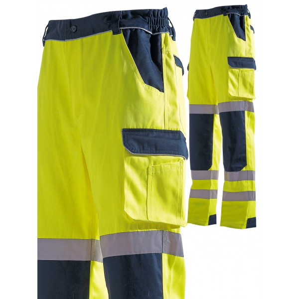 Taille élastiquée sur les côtés. Passant pour ceinture. Braguette avec fermeture à glissière et bouton. Poches nombreuses et variées à l'avant et à l'arrière du vêtement. Emplacement pour genouillères. Bande rétro-réfléchissantes. Matières : 60% Coton / 40% polyester. 280 g/m².