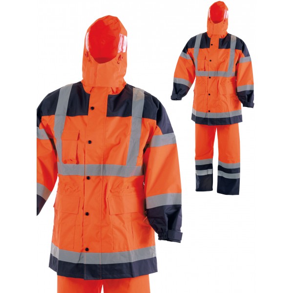 Vêtement de signalisation haute visibilité contre les intempéries constitué de 2 pièces, avec bandes rétro-réfléchissantes. Manteau de pluie : Poches. Capuche fixe enroulée dans le col. Fermeture à glissière centrale sous rabat à pressions. Matière extérieure : polyester Oxford 300 D, enduit polyuréthane. Doublure polyester. Pantalon de pluie : Tissu extérieur polyester Oxford 300 D, enduit polyuréthane. Serrage élastique à la taille. Braguette.