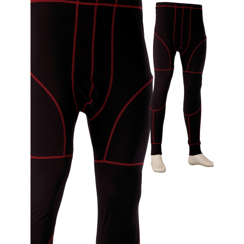 Sous-vêtement chaud. Caleçon long, taille élastiquée. Tailles S/M, L/XL, XXL/XXXL. Composition: 47,50 % Modal®. 47,50 % Coton. 5,00 % Spandex. 200 g/m2. Coloris noir. Surpiqures rouge. Ce produit peut être associé avec le t-shirt manches longues SAHO. (Modal® est une marque déposée de l'entreprise Lenzing AG.)