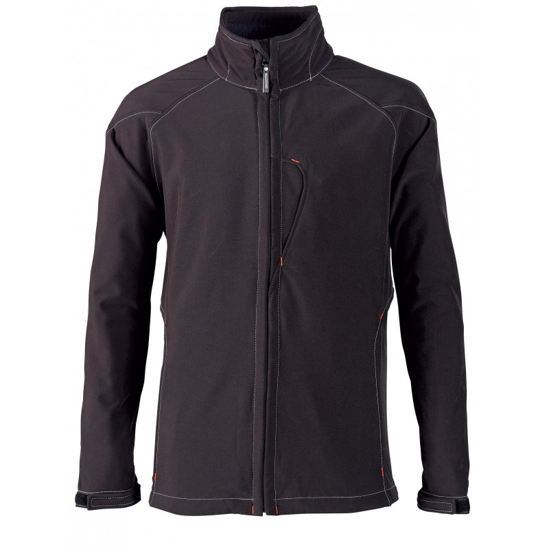 Veste souple coupe-vent. Softshell déperlant. Tailles S, M, L, XL, XXL, XXXL. Coloris noir, contrastes orange. Matières: 94% polyester, 6% élasthanne. Fermeture à glissière centrale. Poignets réglables. Col droit. Intérieur polaire. 3 poches extérieures. Liserés rétroréfléchissants. Serrage élastique à l'intérieur en bas du vêtement par cordon et bloqueurs. Respirant 800 mvp. Imperméable 8000 mm.
