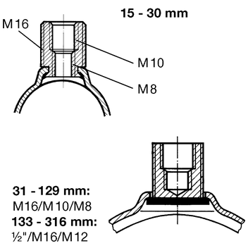 De 15 jusqu'à 129 mm: modèle articulé avec écrous soudés sur les oreilles pour vis de serrage. La vis de serrage est prémontée côté articulation, elle est engagée de l'autre côté et maintenue par une rondelle plastique.