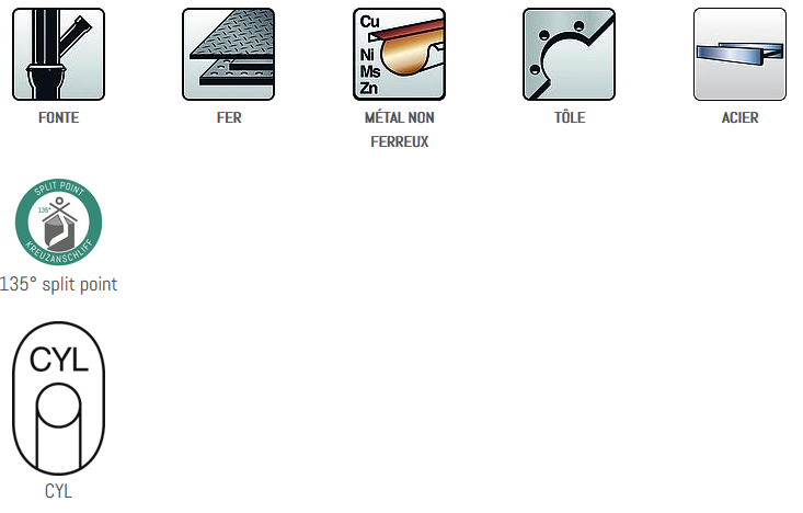 - Affûtage en croix et angle de pointe à 135° pour un centrage optimal lors de l'amorçage