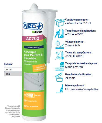 AC702 est un mastic acrylique pour les applications en intérieur et en extérieur abrité, pour les joints à faible mouvement.