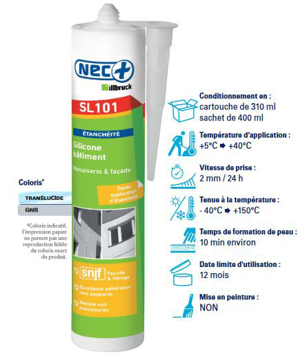 SL101 est un mastic silicone neutre qui réticule avec l’humidité de l’air pour former rapidement un joint d’étanchéité souple et résistant.