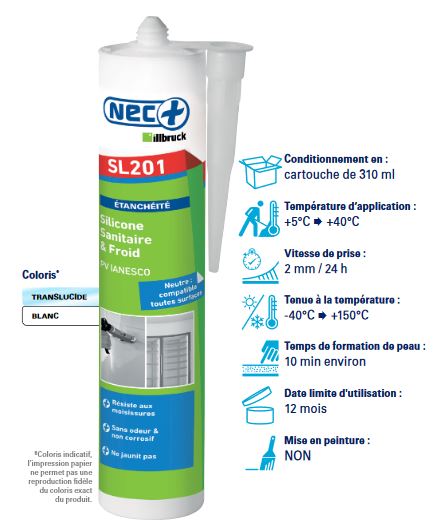 SL201 est un mastic silicone neutre qui réticule avec l'humidité de l’air pour former rapidement un joint d’étanchéité souple et résistant.