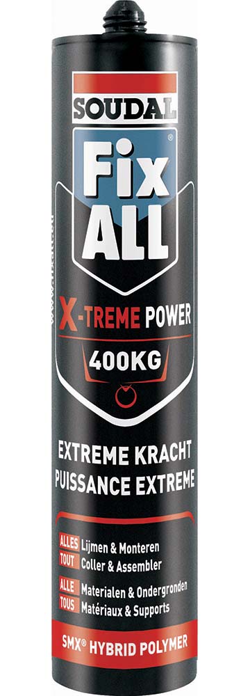 Fix ALL X-Treme Power est un mastic-colle monocomposant élastique neutre de grande qualité à base de SMX polymères, présentant une adhérence initiale extrêmement élevée d'au moins 400 kg/m².